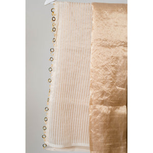 Minimal yet striking, this plain tissue silk saree is enhanced with a fine jewel-detailed edge that adds just the right touch of sparkle. The contrast striped tissue blouse brings a contemporary charm to the look, making it perfect for festive occasions and elegant evenings alike.