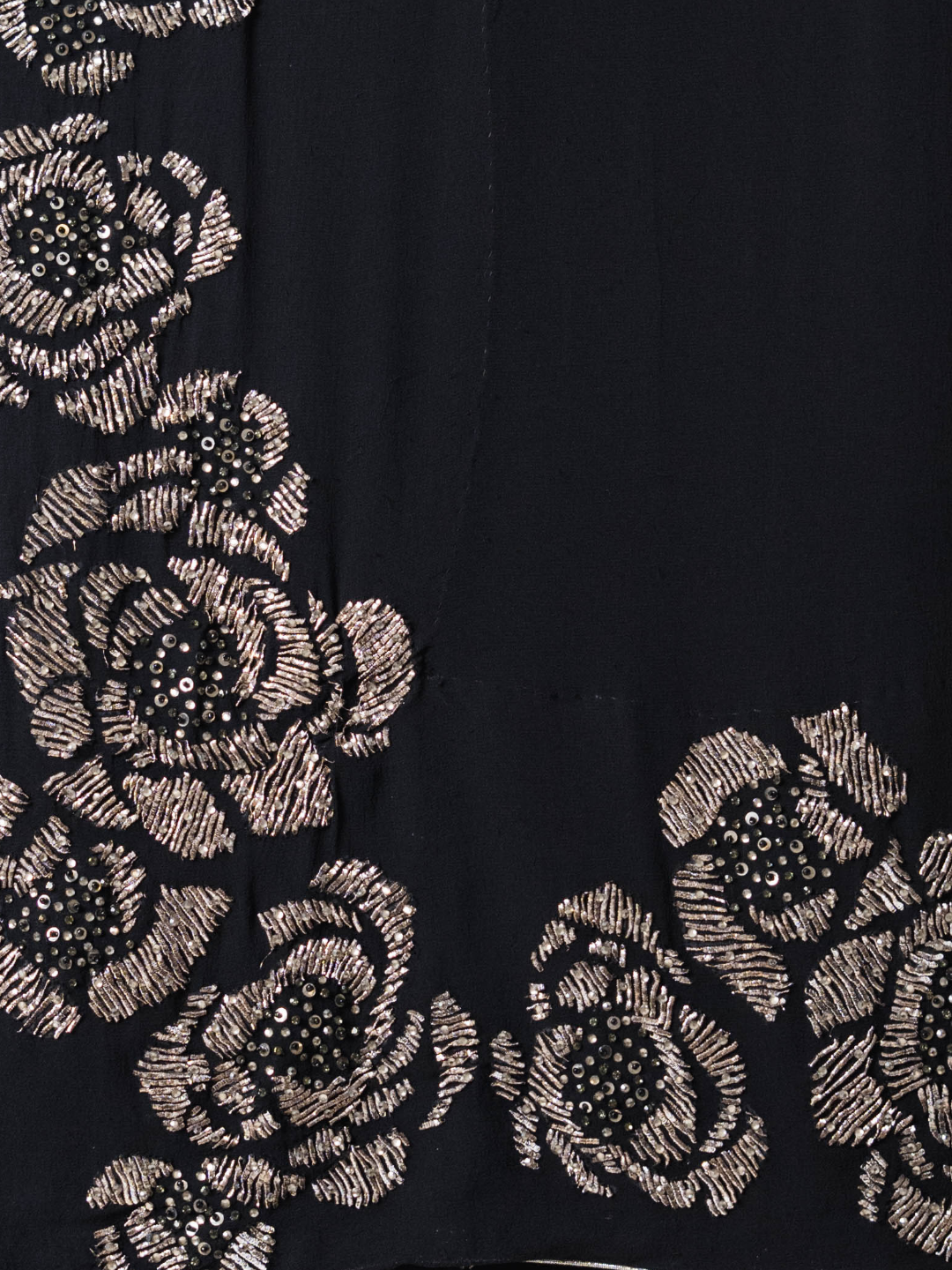 A timeless black silk georgette saree elevated with exquisite hand-embroidered beaten pitta work along the border. The delicate metallic embroidery adds a touch of heritage artistry to the fluid drape of the fabric, creating a look that is graceful, sophisticated, and effortlessly glamorous. Perfect for evening soirées, festive celebrations, and classic occasions that call for understated elegance.
